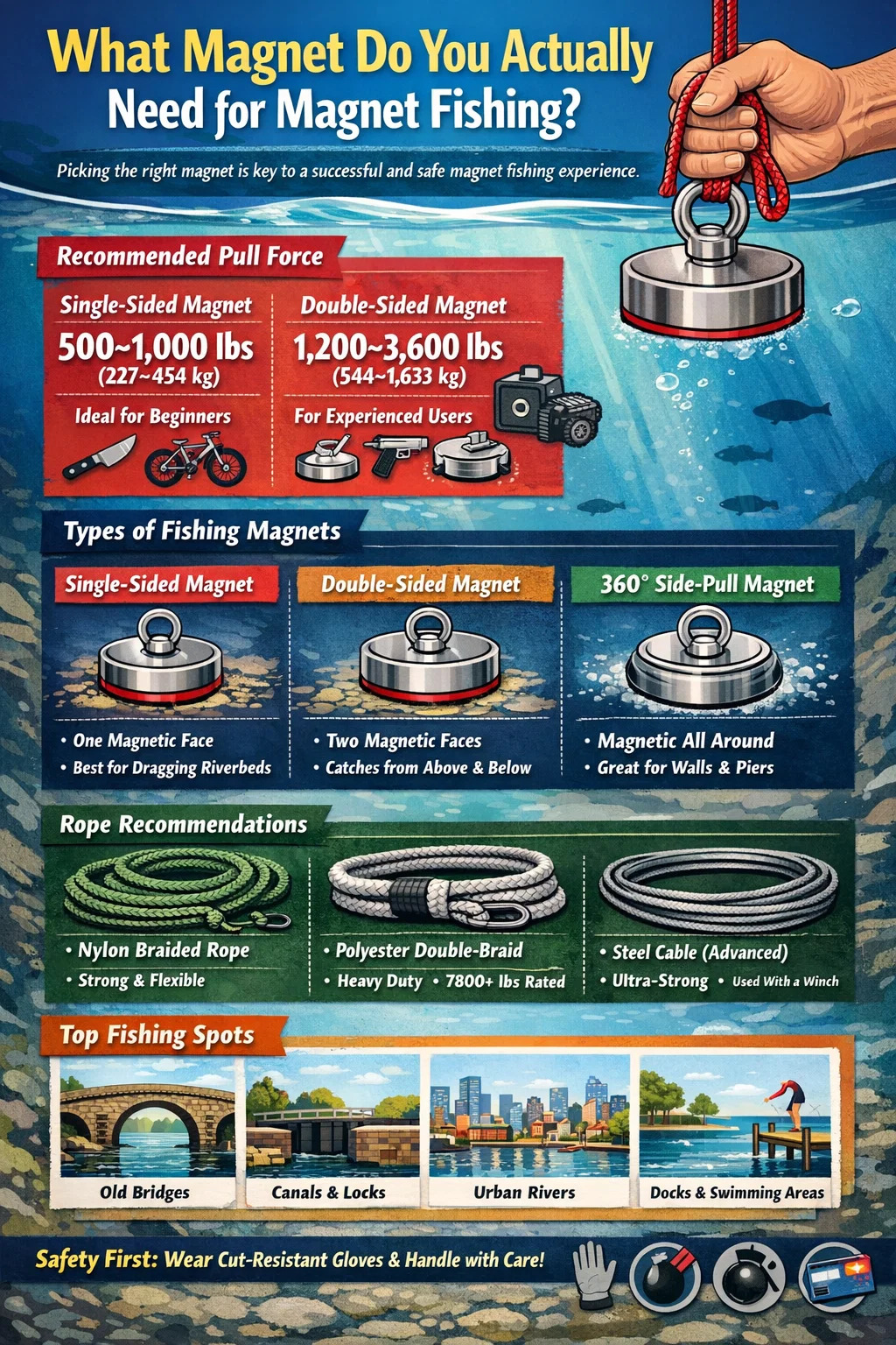 簡単に言うと、ほとんどの初心者にとって、 片面ネオジム磁石、引張力 500 ~ 1,000 ポンド (227 ~ 454 kg) マグネットフィッシングの理想的な出発点です。ナイフ、工具、自転車、さらには金庫を川や湖から回収するのに十分な強度を持ちながら、特別な装備なしでも安全に扱えるほど扱いやすいです。経験豊富な場合、または深海でより重い物体をターゲットにする場合は、1,200 ~ 3,600 ポンドの範囲の両面磁石がより良い選択になります。