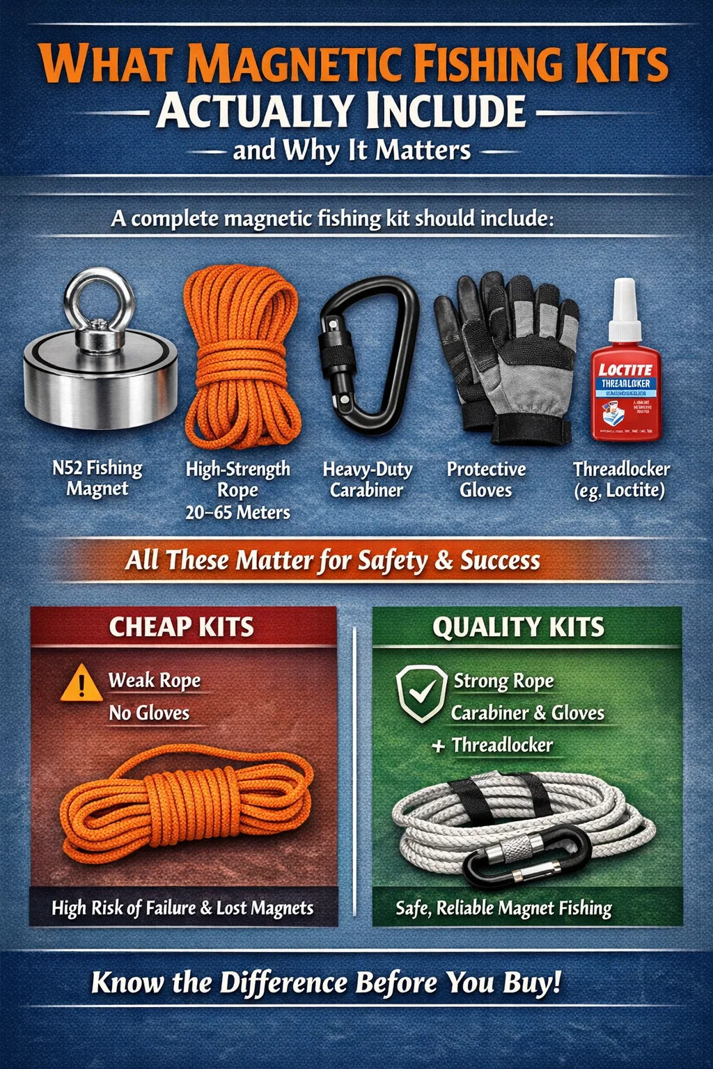 ここで趣味が本当にやりがいのあるものになります。ミッドレンジの磁気釣りキットには通常、定格 500 ~ 800 ポンドの 90 ~ 100 mm N52 ネオジム磁石、高品質の 8 mm ナイロンまたはポリエステル ロープ、頑丈なロック カラビナ、保護手袋、およびネジロック剤の小さなボトルが含まれています。 の thread-locking compound is important — 使用中にアイボルトが緩むのを防ぎます。これは、磁石を固定する方法を知らない初心者が磁石を紛失する最も一般的な原因の 1 つです。