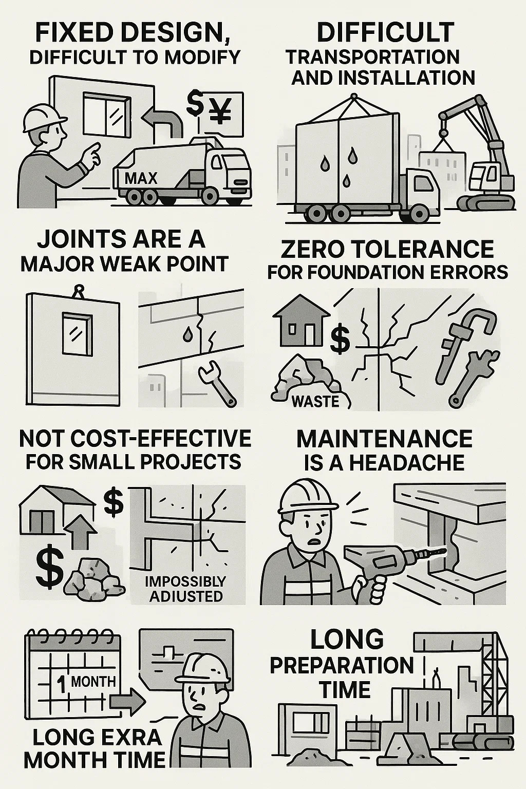 厳格なサイズ制限: コンポーネントの最大サイズは輸送上の制約によって制限されているため (例: トラックは幅 4 メートルの壁パネルを運ぶことができません)、複雑な形状は不可能です。