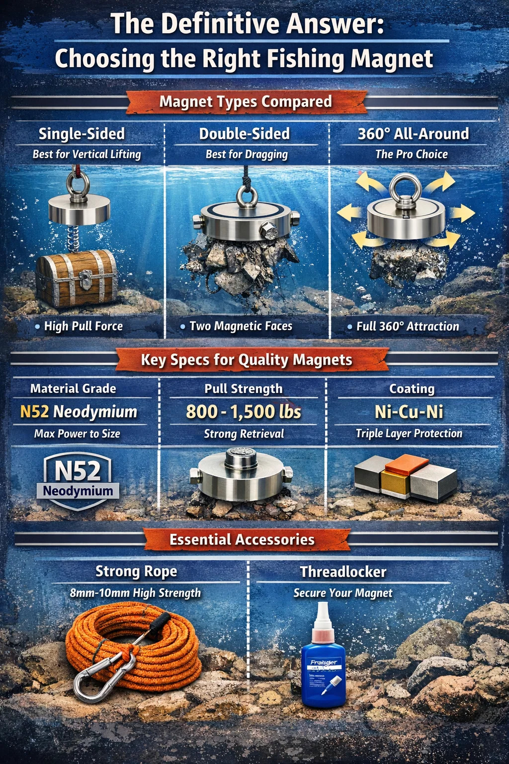 の 360度ネオジム磁石 あらゆる角度から磁力を発揮し、キャッチの可能性を大幅に高めるため、本格的な愛好家にとって最良の選択であると広く考えられています。初心者向けには、 両面釣りマグネット コスト、重量、効果の最適なバランスを実現します。コア材料は常に次のとおりである必要があります。 ネオジム (NdFeB) 、特に N52 グレードは、最新のテクノロジーで利用可能な最高の電力対サイズ比を提供します。